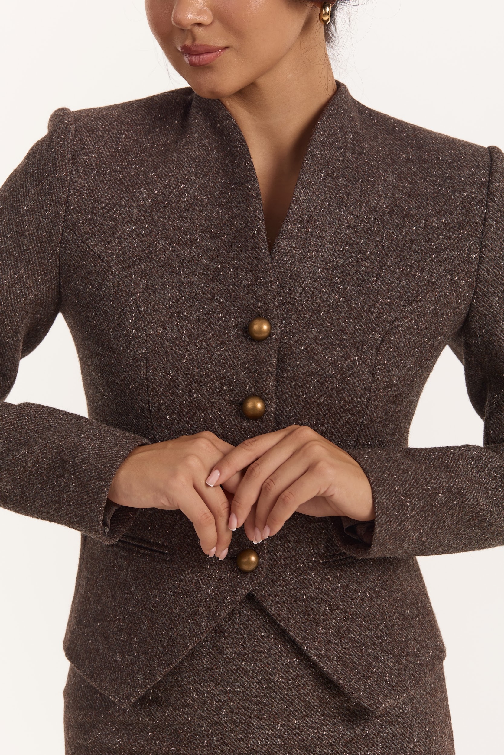 Элегантный двубортный пиджак приталенного кроя, выполненный из премиальной итальянской шерсти с классическим узором «ёлочка». Стильный силуэт подчёркивает фигуру, а глубокий черный оттенок добавляет строгости и универсальности.